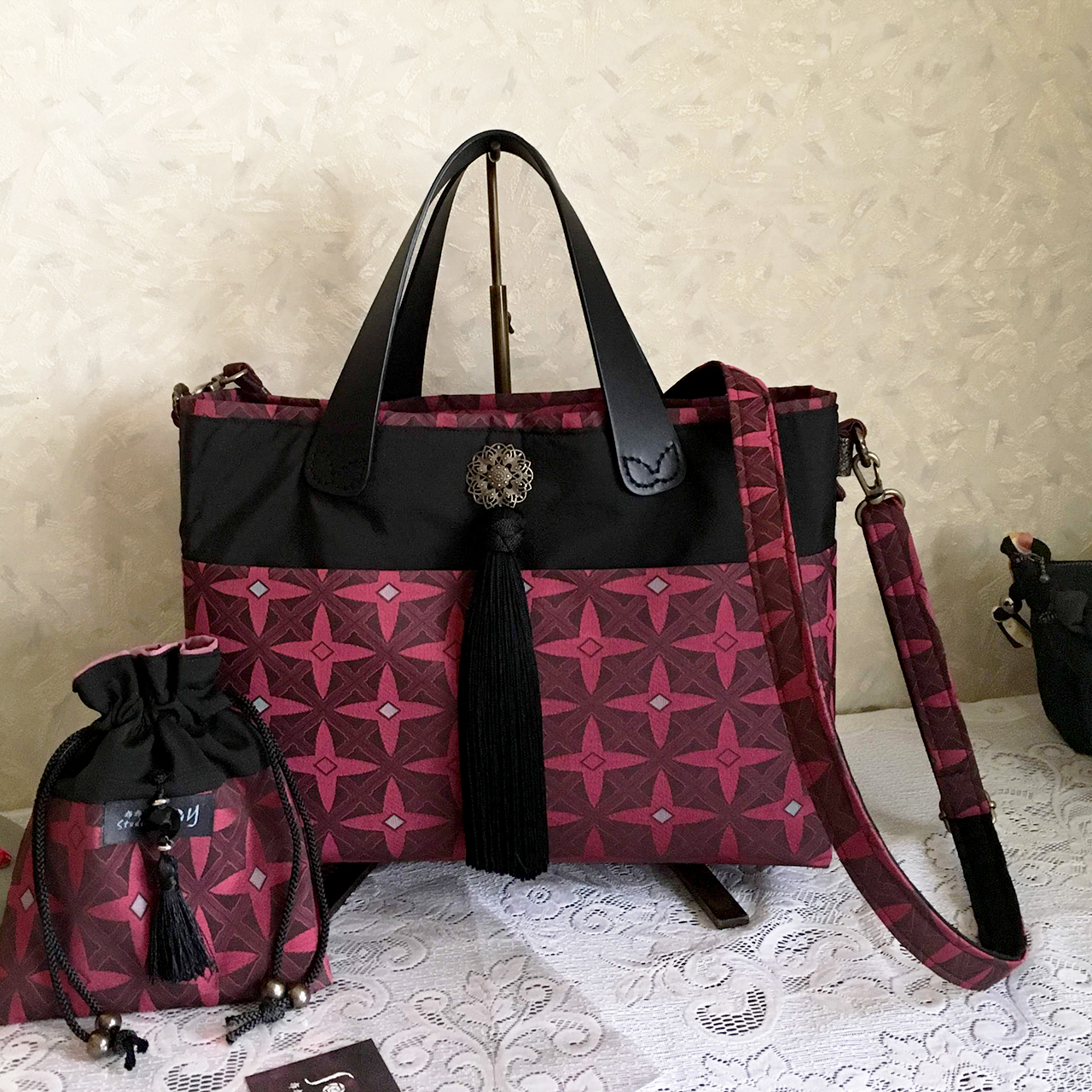 こんにちは。布布Studio SとYです。今回は少し前にご注文いただいてお作りした着物バッグと巾着のセットをご紹介します。ご依頼主さまのご自宅で箪笥にしまわれていたお着物の生地でお作りしました。光沢のある素...