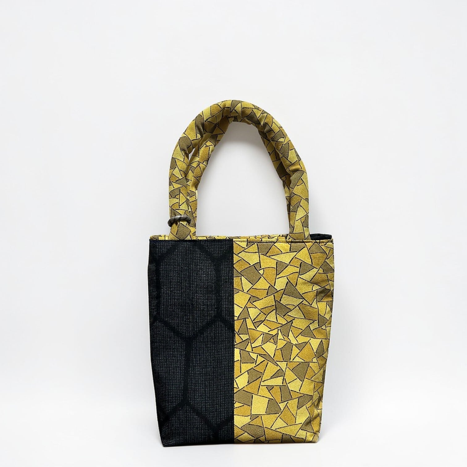 着物地で作ったトートバッグ。日本の伝統と現代のスタイルが融合した唯一無二の一品です。 ブラックと黄色の配色コントラストをお楽しみいただける作品に仕上げました。内側はポケット付きで、コンパクトながらも実用的です。ちょっとしたお出かけやお買い物にぴったりのアイテムです。 ■サイズ:幅17cm(上部19cm)×高さ21cm マチ6cm ■仕様:内ポケット、総裏打ち 作品ID:BG074