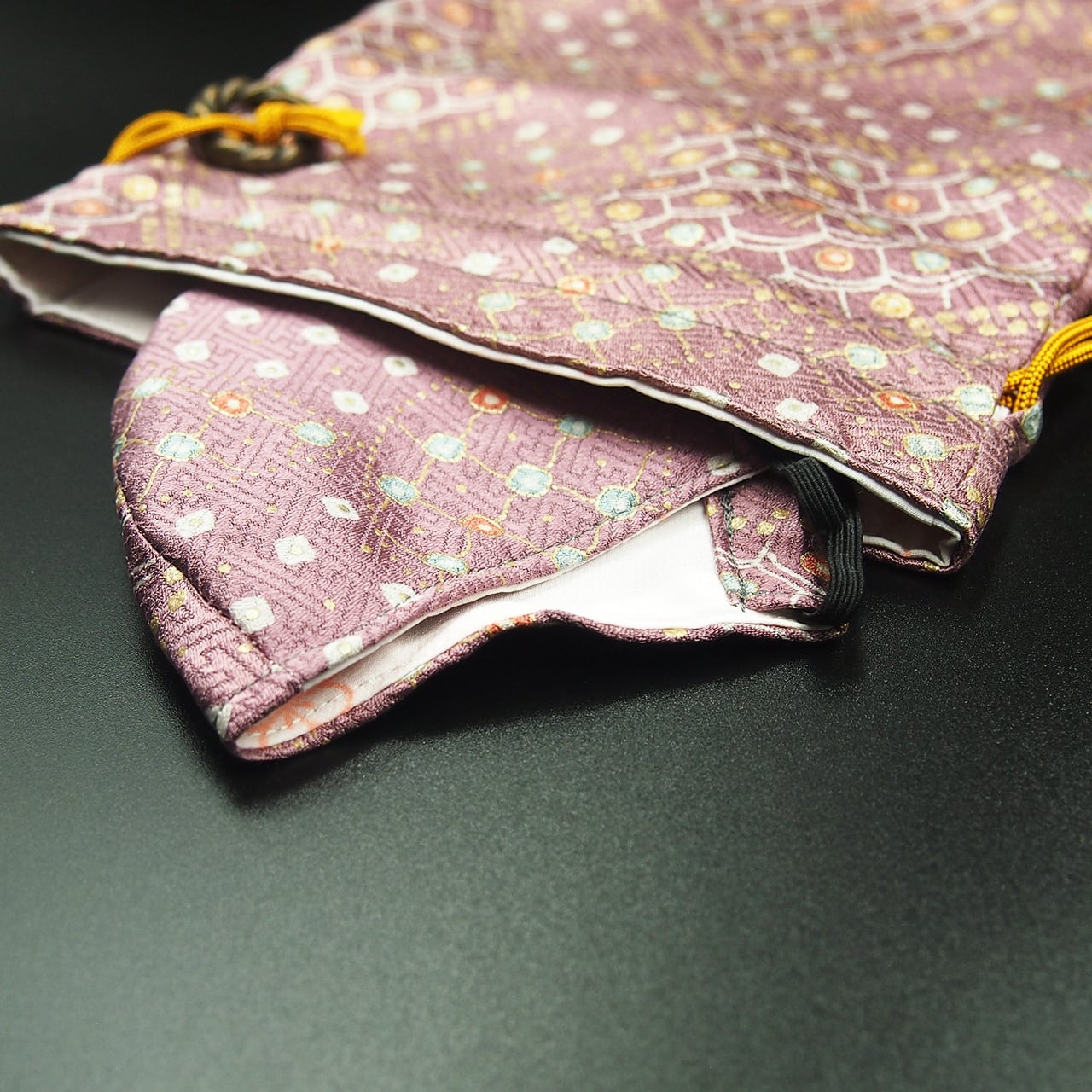 着物地を何度も洗いをかけて制作した洗える立体マスクと、マスクを入れられる巾着のセットです。着物地独特の上品な風合いをお楽しみいただけます。
