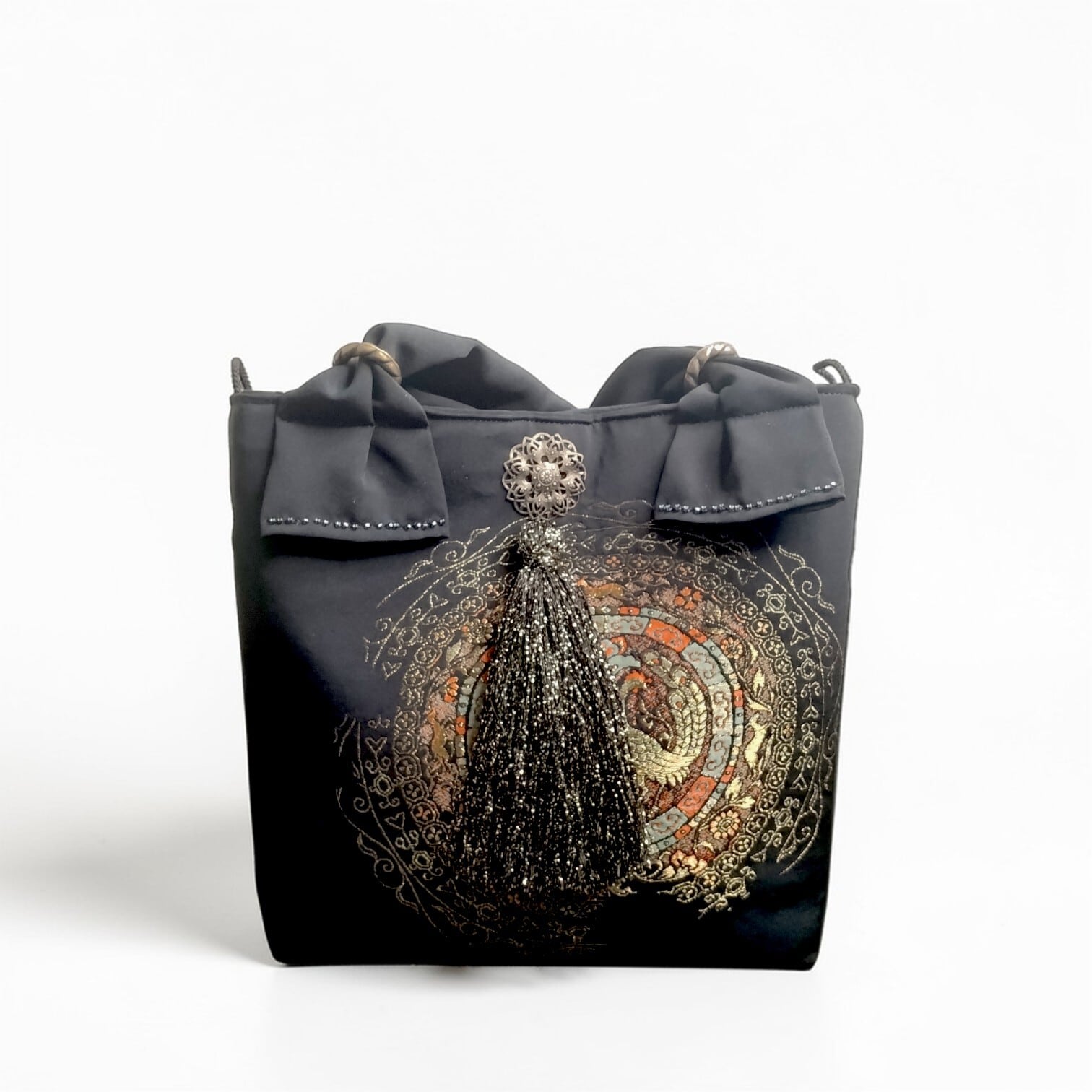 日本の伝統的な着物素材を使用し、シックでエレガントなデザインが特徴的なトートバッグです。黒地に鮮やかなゴールド彩色の鳳凰紋柄が施されたこのバッグは、上品で華やかな印象を与えます。ポイントにビーズをあしらい、シックながらゴージャスな仕上がりに。お手持ちの着物やお洋服とも相性抜群で、普段使いからちょっとしたお出かけまで幅広く活躍すること間違いなしです。